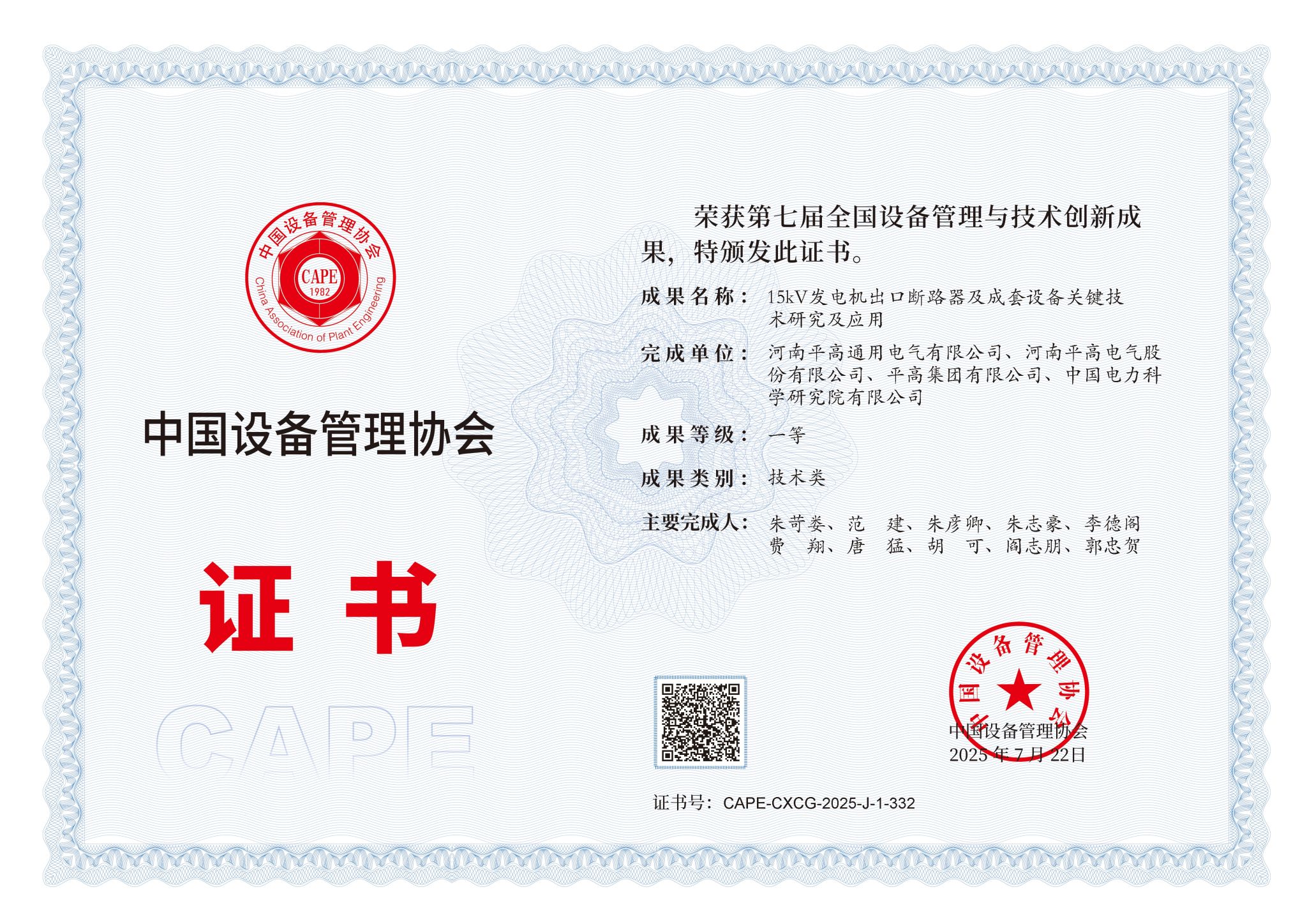 近日,第七屆全國設備管理與技術(shù)創(chuàng)新成果評選揭曉,由河南平高通用電氣有限公司聯(lián)合平高電氣配電院自主研制的“15千伏發(fā)電機出口斷路器及成套設備”榮獲技術(shù)類成果一等獎!該成果攻克大容量真空開斷、高可靠性機構(gòu)設計等核心技術(shù),綜合性能達國際先進水平,為平高能源裝備自主化再添里程碑!