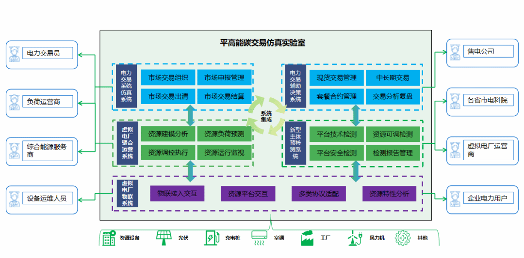 “能碳交易與仿真實驗室”面向虛擬電廠運(yùn)營商與綜合能源服務(wù)商,提供從負(fù)荷管理、資源調(diào)度、接入預(yù)檢測到交易優(yōu)化、碳管理與履約等全鏈條服務(wù),依托產(chǎn)業(yè)鏈優(yōu)勢,為工商業(yè)、公共機(jī)構(gòu)等提供售電及虛擬電廠運(yùn)營支持。實驗室配備源荷儲多類型高精度模擬仿真資源,同時集成虛擬電廠數(shù)據(jù)采集與聚合運(yùn)營系統(tǒng)、新型主體預(yù)檢測系統(tǒng)、電力交易仿真及輔助決策系統(tǒng),支持資源物聯(lián)接入、聚合調(diào)控優(yōu)化、主體預(yù)檢測和交易策略優(yōu)化研究,助力各類主體參與市場化交易。