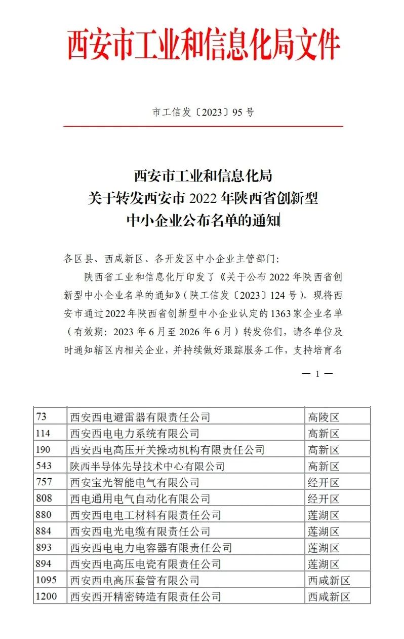 日前,陜西省工信廳印發(fā)《關于公布2022年陜西省創(chuàng)新型中小企業(yè)名單的通知》,文件公布了《西安市2022年陜西省創(chuàng)新型中小企業(yè)名單》,公司所屬西電電力系統(tǒng) 西電套管 西電西容西電西材西電光電纜西電避雷器西電西瓷 西電操動機構 西電通用西開鑄造 寶光智能 先導中心成功入選,被認定為2022年陜西省創(chuàng)新型中小企業(yè)。
