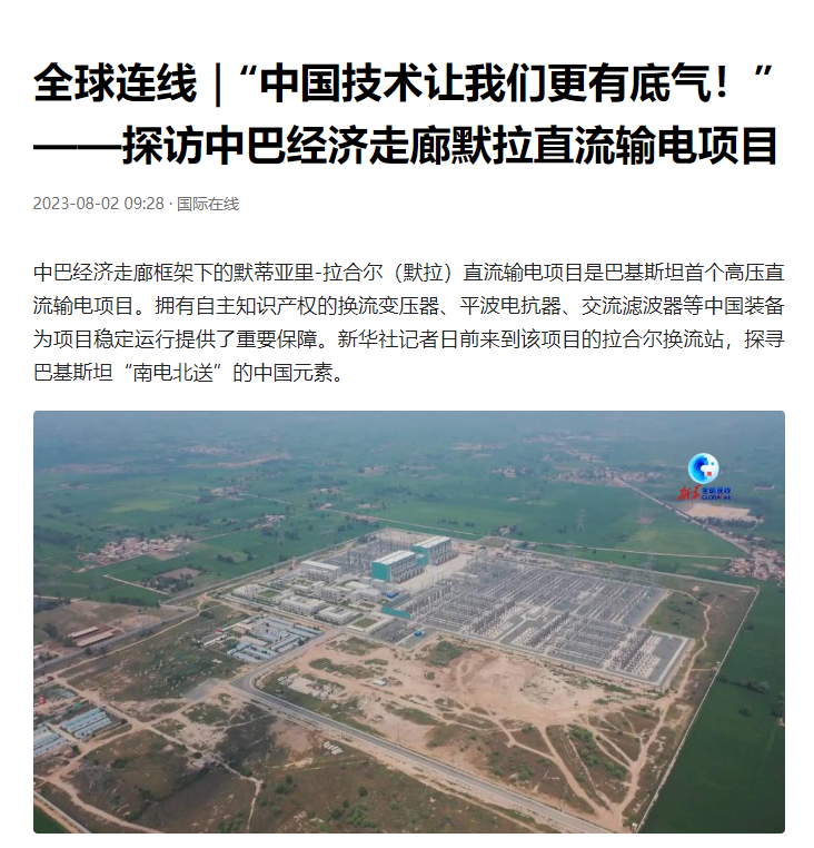 近日,新華社、新華網(wǎng)、今日頭條等主流媒體在重要版面、特別欄目、重點(diǎn)時(shí)段對(duì)中國西電推進(jìn)巴基斯坦電力系統(tǒng)電網(wǎng)升級(jí),參與“一帶一路”建設(shè)取得又一碩果予以重點(diǎn)關(guān)注。新華社、新華網(wǎng)、今日頭條等媒體先后專題報(bào)道中國西電參與建設(shè)的巴基斯坦國內(nèi)第一條直流輸電工程——默蒂亞里—拉合爾±660kV直流輸電工程項(xiàng)目投運(yùn)。報(bào)道指出,該項(xiàng)目有力推動(dòng)了巴基斯坦電力系統(tǒng)實(shí)現(xiàn)骨干電網(wǎng)升級(jí),從此邁入了交直流混聯(lián)電網(wǎng)新時(shí)代,也標(biāo)志著中國西電參與“一帶一路”建設(shè)取得又一碩果。請跟隨鏡頭,感受一對(duì)姐妹城市的心“電”感應(yīng),探尋巴基斯坦“南電北送”中的“中國密碼”。