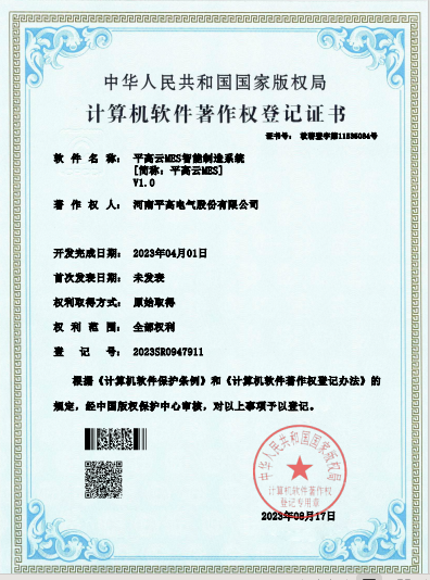 近日,由平高電氣開發的KPI綜合分析系統、平高云MES智能制造系統通過國家版權局審核,獲得2項計算機軟件著作權登記證書。