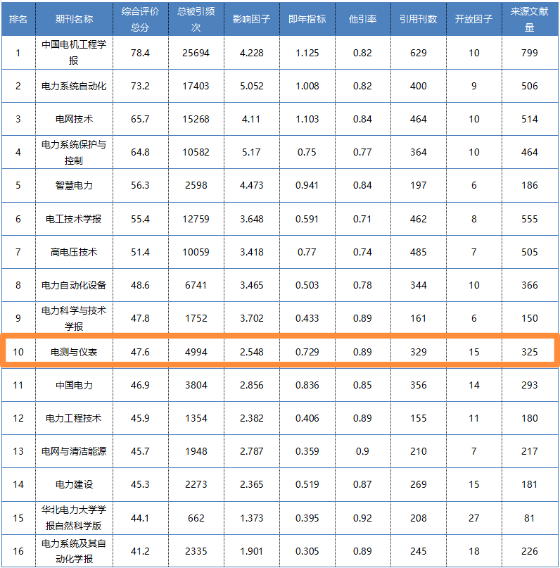 (5)《電測與儀表》在中國科學技術信息研究所發布的《2023年中國科技期刊引證報告(核心版)》中,綜合評價總分在電氣工程類核心期刊中排名首次進入前十名,取得歷史最好成績。