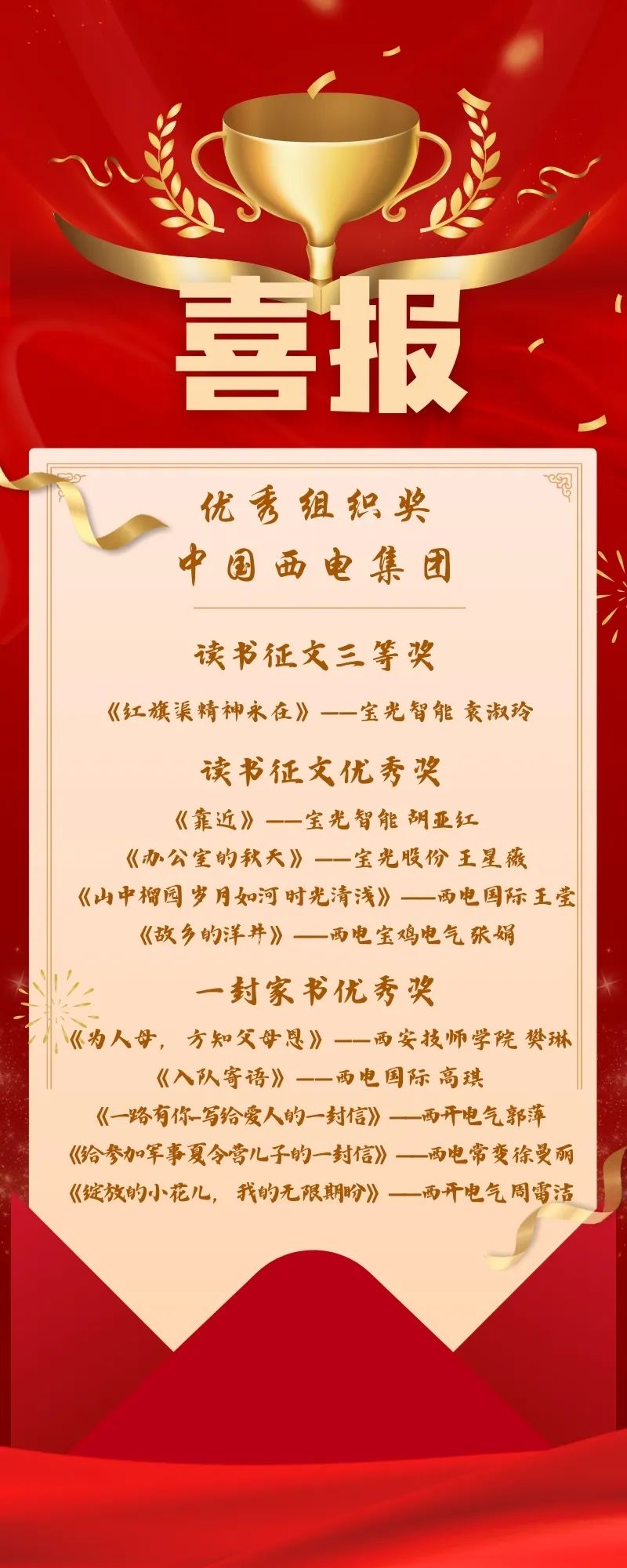 近日,以“閱讀新時代·鑄就新輝煌”為主題的第十一屆“書香三八”讀書活動獲獎作品揭曉,中國西電集團(tuán)工會榮獲優(yōu)秀組織獎,10個作品受到組委會表彰,這是西電集團(tuán)連續(xù)八年參加全國“書香三八”讀書活動并獲獎。