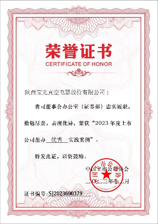 自寶光股份上市以來,董事會與管理層高度重視各項工作,董辦團隊切實關注各項履職能力提升,堅守初心,嚴格按照法律法規(guī)開展各項工作。獲得此項榮譽充分體現(xiàn)了中國上市公司協(xié)會對寶光股份董事會辦公室信息披露管理、治理機制建設、投資者關系管理、相關制度制定修訂、ESG管理披露、監(jiān)督培訓等各項工作成果的高度認可和充分肯定。