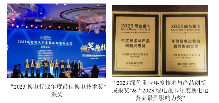 2023年12月23日,許繼攜智能重卡換電站入圍由中國充電樁網(wǎng)與充換電百人會聯(lián)合主辦的“2023中國換電行業(yè)年度品牌”評選,榮獲“2023換電行業(yè)年度最佳換電技術(shù)獎”;入圍中國電車資源主辦的“中國新能源物流車2023綠色城配&綠色重卡年度品牌”評選,榮獲“2023綠色重卡年度技術(shù)與產(chǎn)品創(chuàng)新成果獎”和“2023綠電重卡年度換電運營商最具影響力獎”。