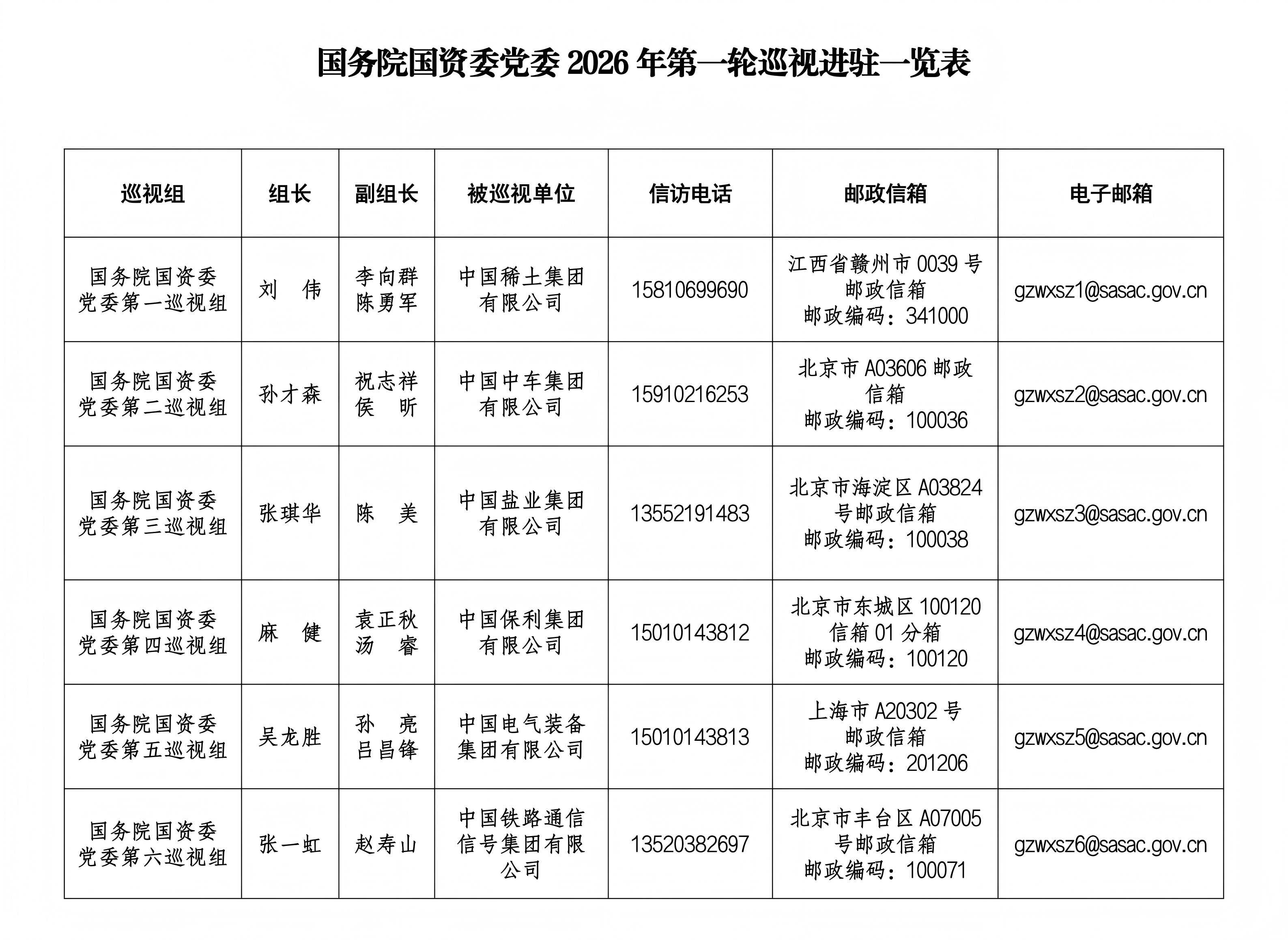 按照國(guó)務(wù)院國(guó)資委黨委和巡視工作領(lǐng)導(dǎo)小組部署安排,截至2026年4月10日,國(guó)務(wù)院國(guó)資委黨委2026年第一輪巡視完成進(jìn)駐工作。國(guó)務(wù)院國(guó)資委黨委6個(gè)巡視組將對(duì)中國(guó)鹽業(yè)集團(tuán)有限公司、中國(guó)稀土集團(tuán)有限公司、中國(guó)中車(chē)集團(tuán)有限公司、中國(guó)鐵路通信信號(hào)集團(tuán)有限公司、中國(guó)保利集團(tuán)有限公司、中國(guó)電氣裝備集團(tuán)有限公司等6家企業(yè)黨委開(kāi)展常規(guī)巡視。