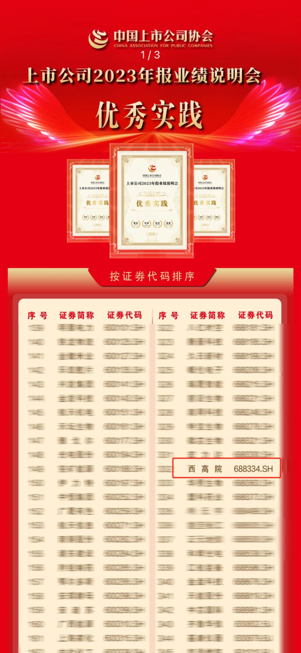 此次榮獲“2023年報(bào)業(yè)績(jī)說(shuō)明會(huì)優(yōu)秀實(shí)踐獎(jiǎng)”,充分體現(xiàn)了市場(chǎng)對(duì)西高院在投資者關(guān)系管理領(lǐng)域規(guī)范運(yùn)作、創(chuàng)新發(fā)展的肯定與認(rèn)可。未來(lái),西高院將繼續(xù)秉承“釋投資者之疑問(wèn),護(hù)投資者之信心”理念,持續(xù)提升信息披露質(zhì)量和投資者關(guān)系管理水平,推動(dòng)西高院高質(zhì)量發(fā)展。