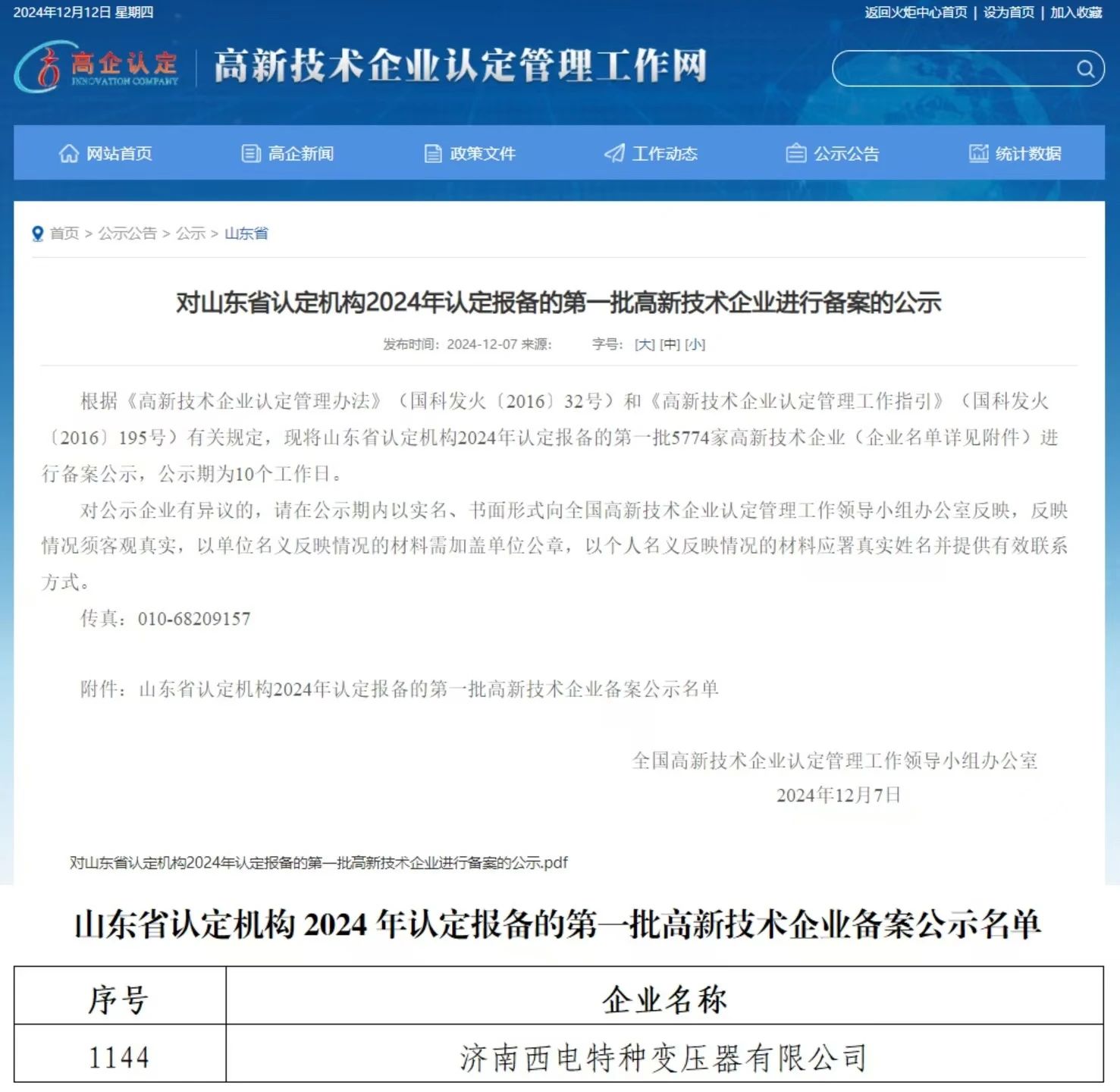 近日,全國高新技術企業(yè)認定管理工作領導小組辦公室正式公示山東省2024年高新技術企業(yè)名單,中國西電所屬濟變濟特順利通過評審,獲得國家高新技術企業(yè)稱號。