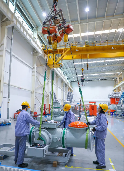 伴隨著警笛聲,挑高20米的無(wú)塵車間內(nèi),行車伸出強(qiáng)有力的“手臂”將零部件吊裝至適宜高度,根據(jù)工人裝配需求,進(jìn)行多角度旋轉(zhuǎn)。這樣“人機(jī)共舞”忙碌的景象正在廈門許繼高壓生產(chǎn)車間中上演。