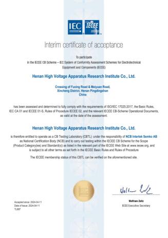 近日,平高集團所屬企業(yè)河南省高壓電器研究所有限公司(以下簡稱“研究所”)獲得國際電工委員會電工產(chǎn)品合格檢測與認證組織(IECEE)建立的電工產(chǎn)品安全檢測結(jié)果全球互認體系(CB)認證,成為瑞典Intertek Semko AB國家認證機構(gòu)(NCB)授權(quán)認證的CB檢測實驗室(CBTL)。