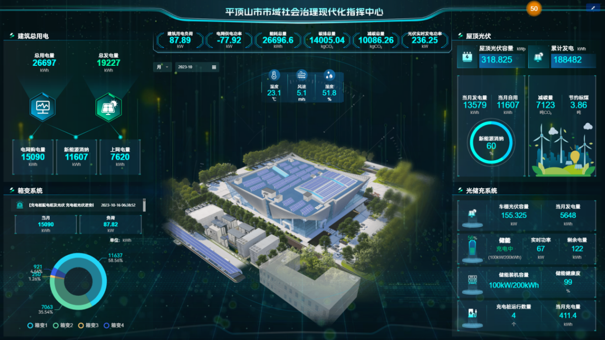 據(jù)了解,此次獲獎項目以平頂山市市域社會治理現(xiàn)代化指揮中心為依托,通過建設綠色供電系統(tǒng)、光儲充微網系統(tǒng)及智慧管控系統(tǒng),開展智能配電運維,打造“綠色低碳、能源物聯(lián)”的新型智慧化場館建筑。項目已于2022年12月投運,累計產生綠電575471千瓦時,減少二氧化碳排放474.2噸,實現(xiàn)指揮中心“節(jié)能降碳、智能用電、智慧物聯(lián)”,建造鷹城公共建筑節(jié)能降碳標桿示范工程。