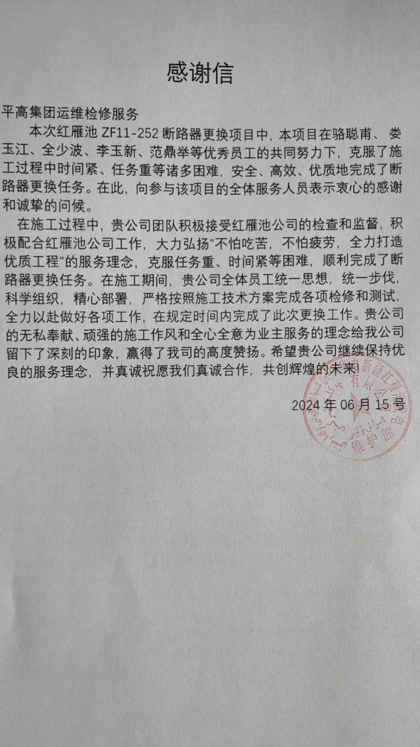 自春檢開始以來,運(yùn)檢服務(wù)/電力檢修不怕吃苦,保質(zhì)保量,想客戶之所想,急客戶之所需,順利完成了春檢期間的各項(xiàng)檢修項(xiàng)目,得到各個(gè)地區(qū)客戶的認(rèn)可,累計(jì)收到客戶感謝信20封、錦旗3面。