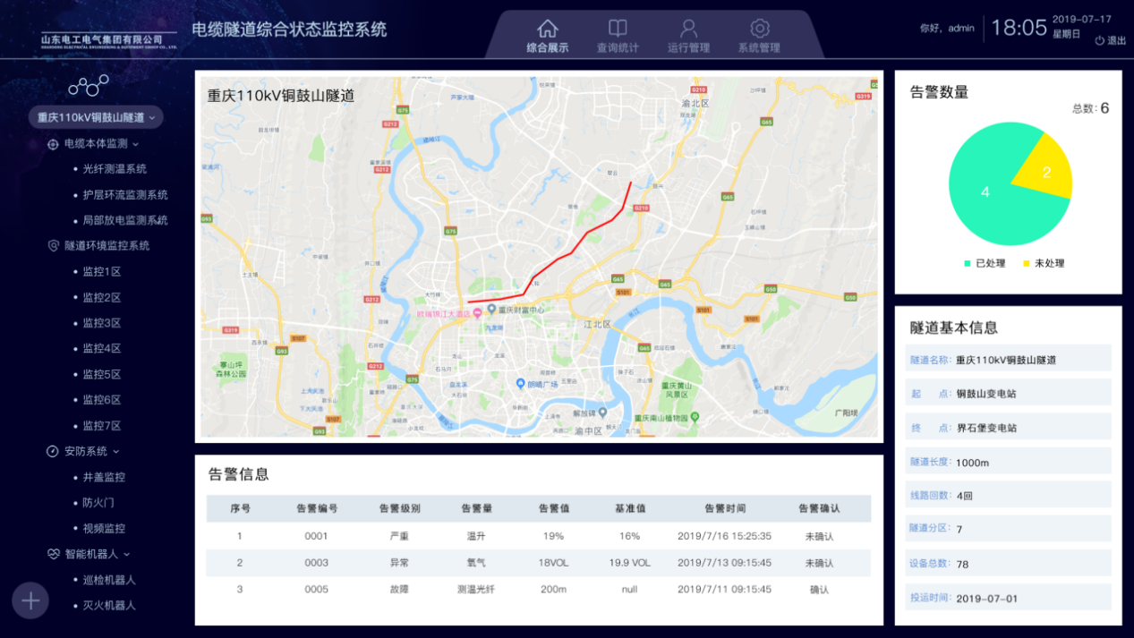 電纜隧道綜合監(jiān)控系統(tǒng)由山東電工電氣所屬數(shù)字科技自主研制,通過國家級新產(chǎn)品鑒定,達到國際先進水平。該產(chǎn)品具有電纜線路及通道環(huán)境狀態(tài)綜合診斷、風險預警、差異化運維決策、老化評估、退役決策等智能化運維管控功能。產(chǎn)品先后在重慶江北110千伏電纜隧道綜合監(jiān)控工程、西安東北部330千伏架空線路遷改落地工程等國家電網(wǎng)重點示范工程應用。