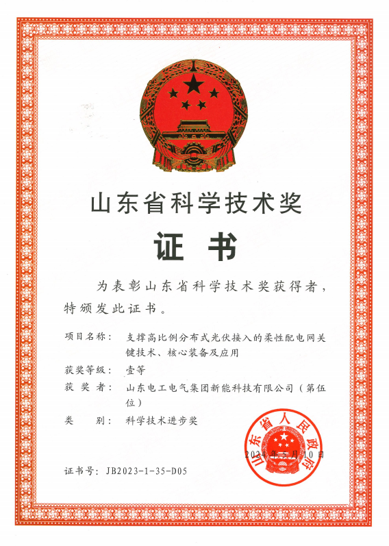 近日,山東省人民政府發(fā)布《關(guān)于2023年度山東省科學(xué)技術(shù)獎(jiǎng)勵(lì)的決定》,山東電工電氣所屬新能科技參與完成的“支撐高比例分布式光伏接入的柔性配電網(wǎng)關(guān)鍵技術(shù)、核心裝備及應(yīng)用”項(xiàng)目榮獲山東省科學(xué)技術(shù)進(jìn)步獎(jiǎng)一等獎(jiǎng)。