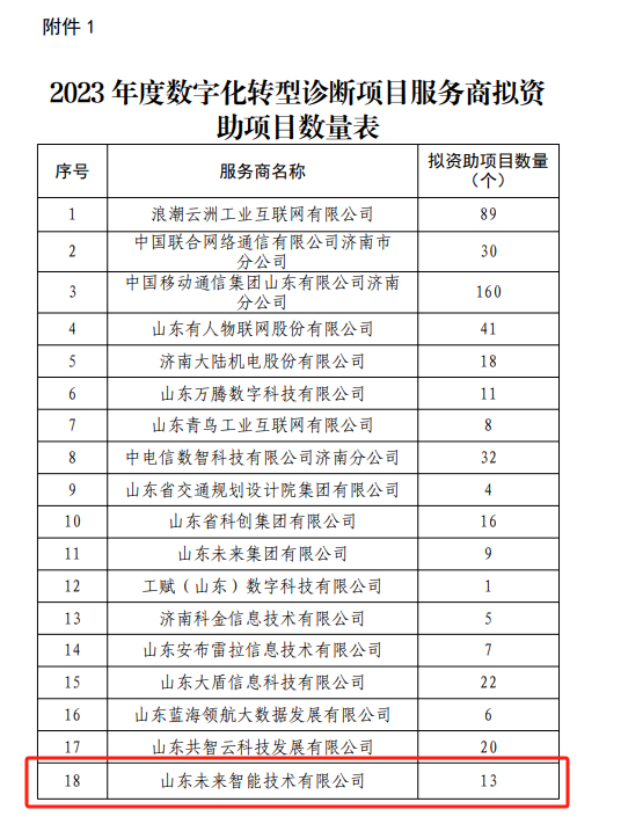 未來智能作為技術(shù)實(shí)力雄厚、服務(wù)能力及社會(huì)責(zé)任感強(qiáng)的數(shù)字化轉(zhuǎn)型診斷服務(wù)商,助力推進(jìn)數(shù)字化轉(zhuǎn)型診斷服務(wù)工作,實(shí)現(xiàn)以數(shù)字化轉(zhuǎn)型診斷引領(lǐng)數(shù)字化轉(zhuǎn)型的目標(biāo)。2023年,未來智能為多家濟(jì)南市本地企業(yè)提供數(shù)字化轉(zhuǎn)型診斷服務(wù),幫助企業(yè)找準(zhǔn)關(guān)鍵業(yè)務(wù)痛點(diǎn),量身定制數(shù)字化轉(zhuǎn)型方案,解決各類應(yīng)用場(chǎng)景難題。在濟(jì)南市工信局公示的2023年度數(shù)字化轉(zhuǎn)型診斷服務(wù)商擬資助項(xiàng)目中,未來智能13個(gè)服務(wù)項(xiàng)目入選。