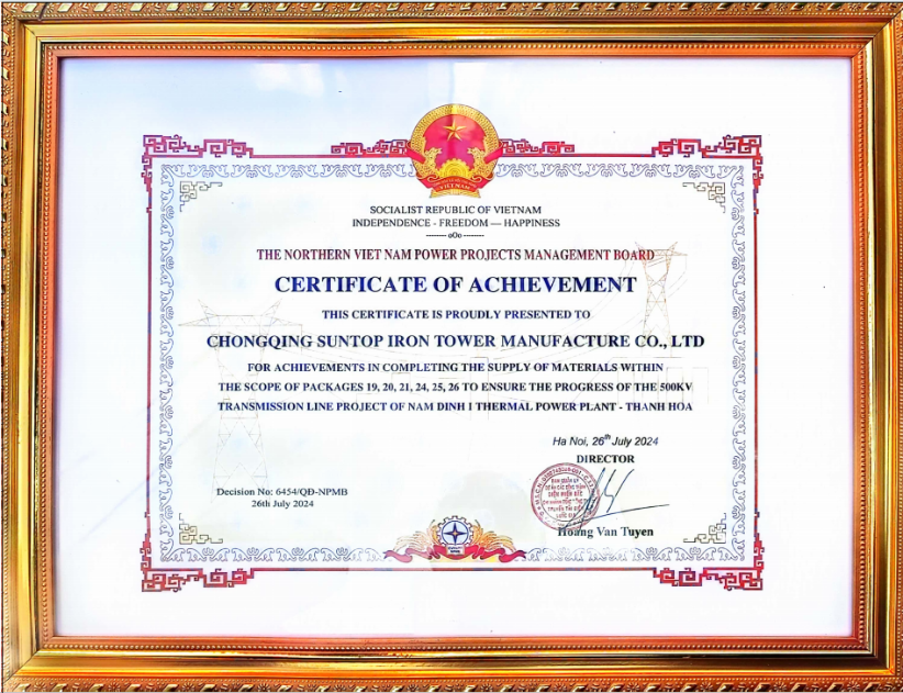 近日,越南南定一號火力發(fā)電廠至清化500千伏輸電線路工程其中3條線路正式通電。山東電工電氣所屬重慶順泰獲越南北部電力項目管理委員會頒發(fā)“成就證書”,對企業(yè)在越南南定一號火力發(fā)電廠-清化500千伏輸電線路工程中優(yōu)質(zhì)高效供貨表示肯定,是該工程線路鐵塔供貨企業(yè)中唯一獲此殊榮的供應(yīng)商。
