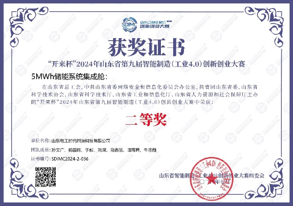 近日,山東電工時代能源(以下簡稱“電工時代”)參加由山東省總工會、共青團(tuán)山東省委、山東省科學(xué)技術(shù)協(xié)會、山東省科學(xué)技術(shù)廳、山東省工業(yè)和信息化廳共同舉辦的“開來杯”2024年山東省第九屆智能制造(工業(yè)4.0)創(chuàng)新創(chuàng)業(yè)大賽決賽,取得二等獎的優(yōu)秀成績。