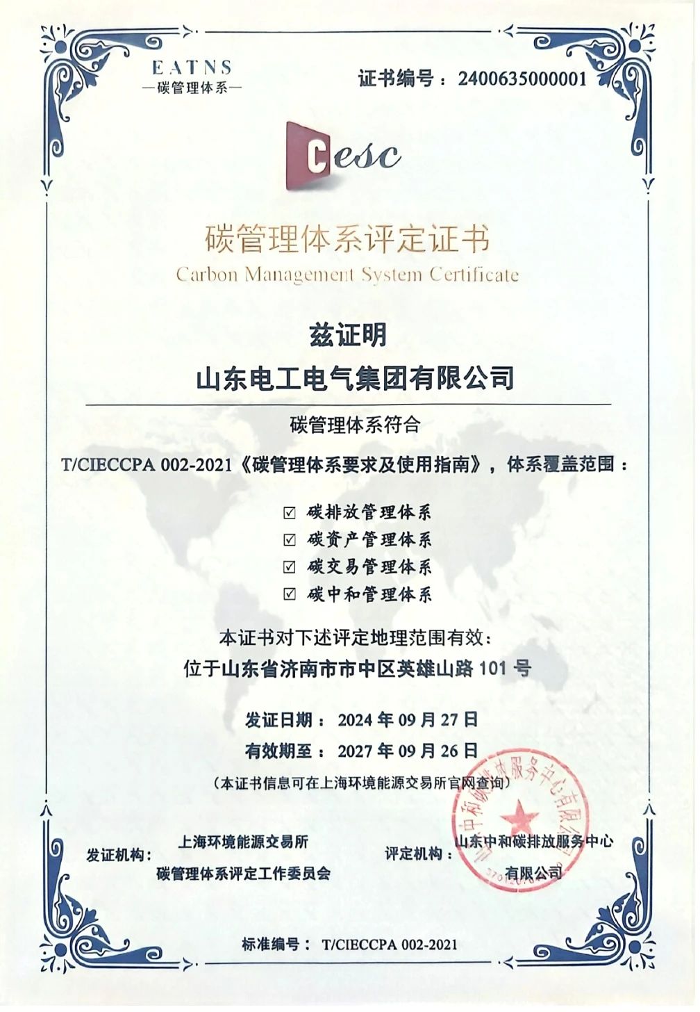近日,山東電工電氣榮獲“EATNS碳管理體系評定證書”,標(biāo)志著山東電工電氣成為山東省制造業(yè)首個通過碳管理體系貫標(biāo)認(rèn)證項目的示范單位。