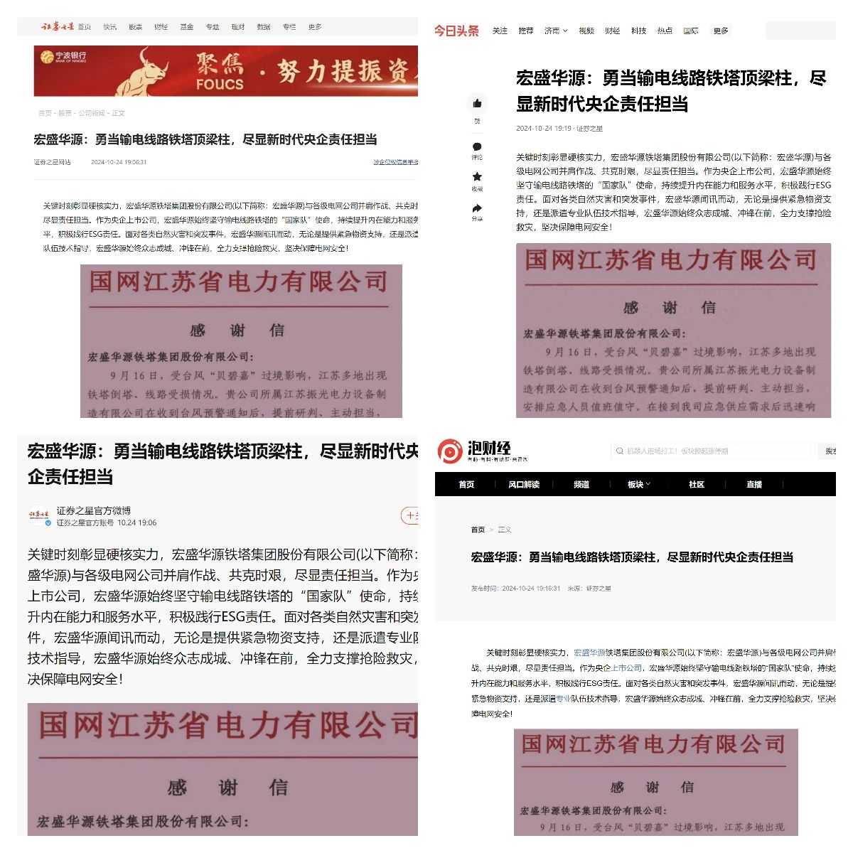關(guān)鍵時刻彰顯硬核實力,近日,山東電工電氣所屬宏盛華源鐵塔集團股份有限公司(以下簡稱:宏盛華源)與各級電網(wǎng)公司并肩作戰(zhàn)、共克時艱,盡顯責任擔當,獲多家媒體報道。作為央企上市公司,宏盛華源始終堅守輸電線路鐵塔的“國家隊”使命,持續(xù)提升內(nèi)在能力和服務水平,積極踐行ESG責任。面對各類自然災害和突發(fā)事件,宏盛華源聞訊而動,無論是提供緊急物資支持,還是派遣專業(yè)隊伍技術(shù)指導,宏盛華源始終眾志成城、沖鋒在前,全力支撐搶險救災,堅決保障電網(wǎng)安全。